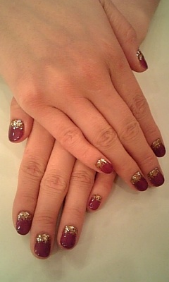 ★エレガント色★ 今日は11月上旬並みの気温で、一気に秋でしたね〜 風邪ひきそ〜…気をつけましょ〜!! 秋冬にやりたくなるのがエレガント色のネイルですよね〜 ボルドーカラーのカルジェルに根元ゴールドラメにされて行かれたお客様♪ 超〜お似合いでした♪ JUN