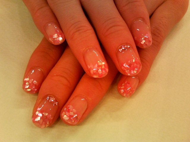 ピンクシェル★ カルジェルの中にかわいいかわいい、 ピンクシェルをたっぷり入れました〜〜。 角度によって光り方が変わってキレイです! ラメやホログラムに飽きてしまった方に おすすめですよ♪他にもパープルやブルーなど、 多色ありますので是非チャレンジしてみて下さいね! AIKO