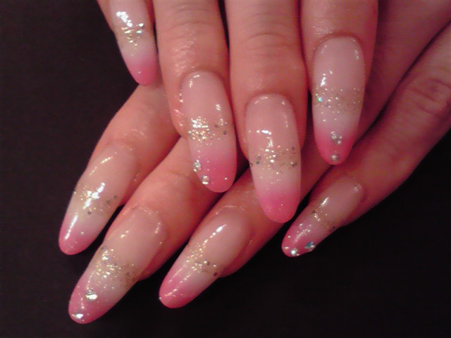運気UP!? お客様のお爪です♪ エアブラシで白とピンクの2色グラデーションにして、 コールドラメをキラリ☆ポイントでストーンもつけました〜。 恋愛運UPのピンクと、金運UPのゴールドを使った 運気が上がりそうなネイルです★ AIKO