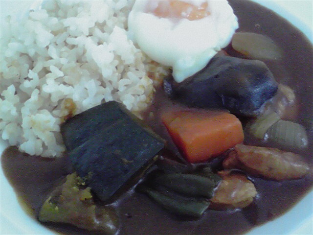 カレー☆ この前お客様とカレーの話をしていたら、無性に食べたくなって 次の日早速作っちゃいました★ 鶏肉と、人参・玉ねぎ・カボチャ・ピーマン・茄子・ジャガイモ…と、 家にあった野菜をたっぷり入れました☆温泉たまごもトッピング♪ 健康に気をつかってご飯は玄米MIXです! あらためて、カレーっておいしいですよね(笑) AIKO
