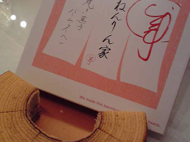 バームクーヘン☆ TVや雑誌によくでている、大丸の“ねんりん家”で、 念願のバームクーヘンを買ってきました〜〜。 最近V6の番組でやっていたこともあって、結構人が並んでました! 日持ちするものとしないものがあり、今回はみんなで食べるのに 日持ちするものを買ってきました♪ 冷蔵庫に入れておいたのにとても柔らかくて おいしかったです★ 今度は日持ちしない方を食べてみようと思います! きっと更においしいんだろうなぁ〜〜。 AIKO