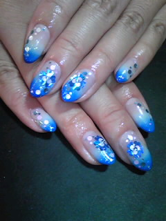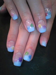 ブルー人気★ 夏に向けてブルーが人気急上昇です! ブルーの2色グラデーションに人気のホログラムのお花でアート♡ こちらは水色のグラデーションに押し花を♪ ブルーって普段は少し挑戦しにくい色ですが つけてみるとすっごくかわいいのでオススメですよ〜! AYA