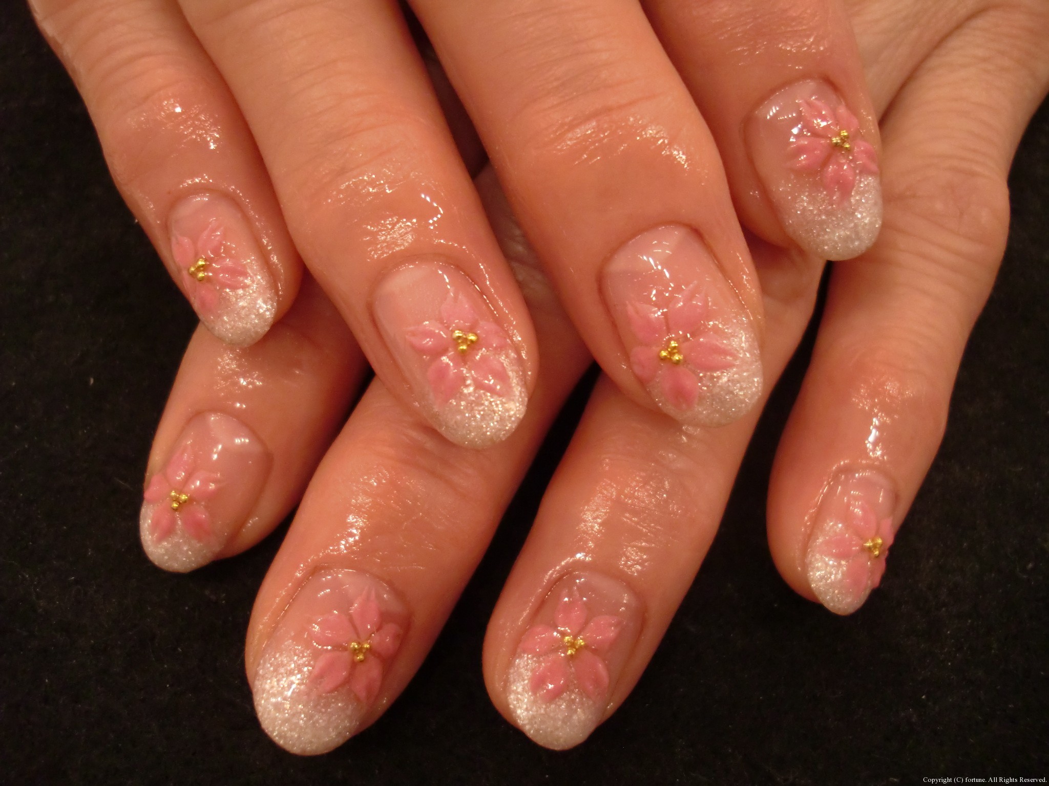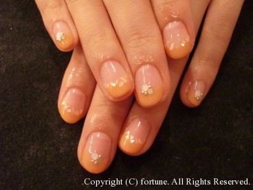 春ネイル♪ 新作デザインのフレンチバージョン♪ やわらかいオレンジ色がキレイですね。 薄いベージュのグラデーションに、3Dのお花♡ OLさんも、これくらいなら大丈夫ですよね♪ 毎日、可愛いネイルなら頑張れますよね!! NAOKO