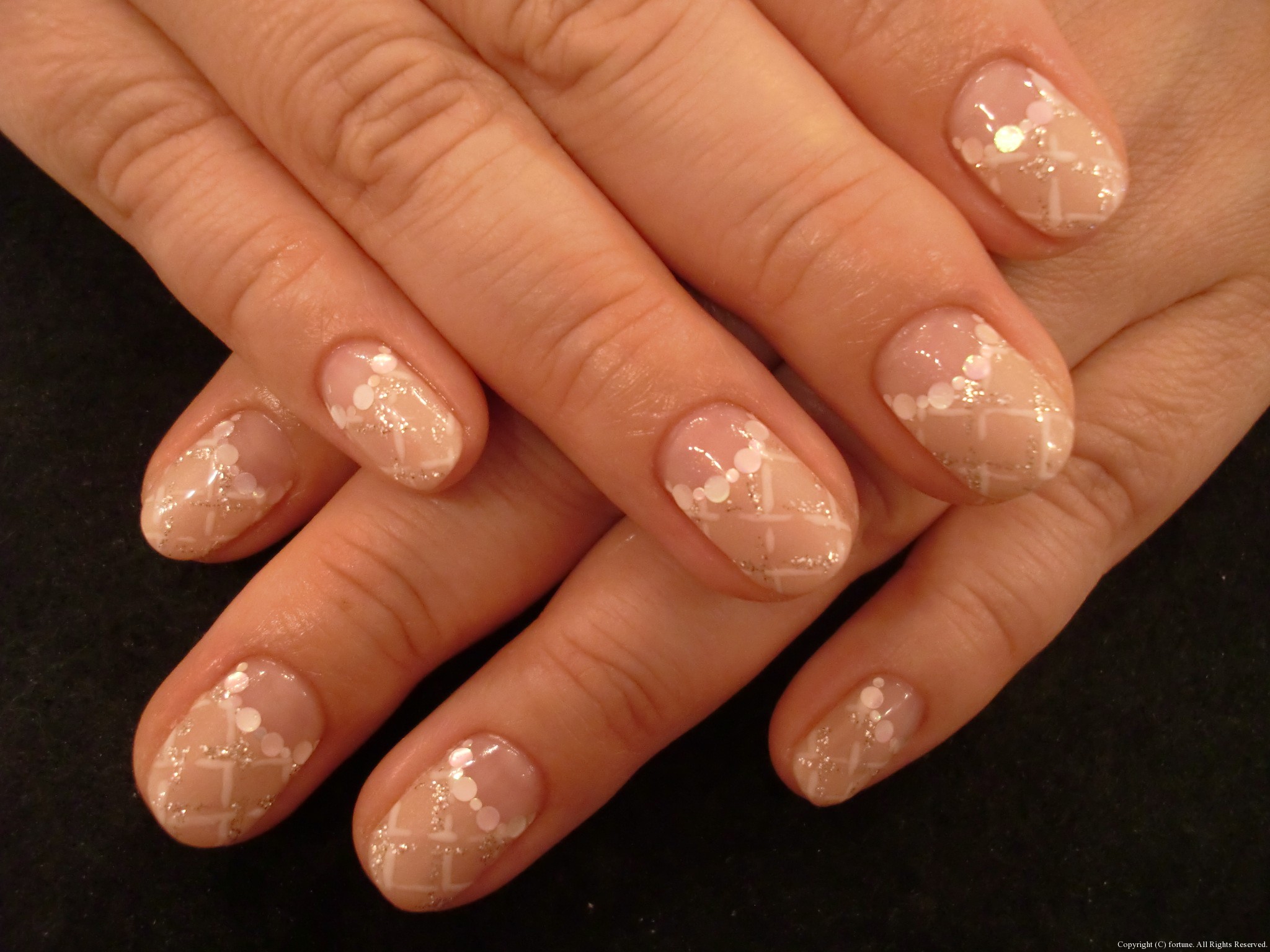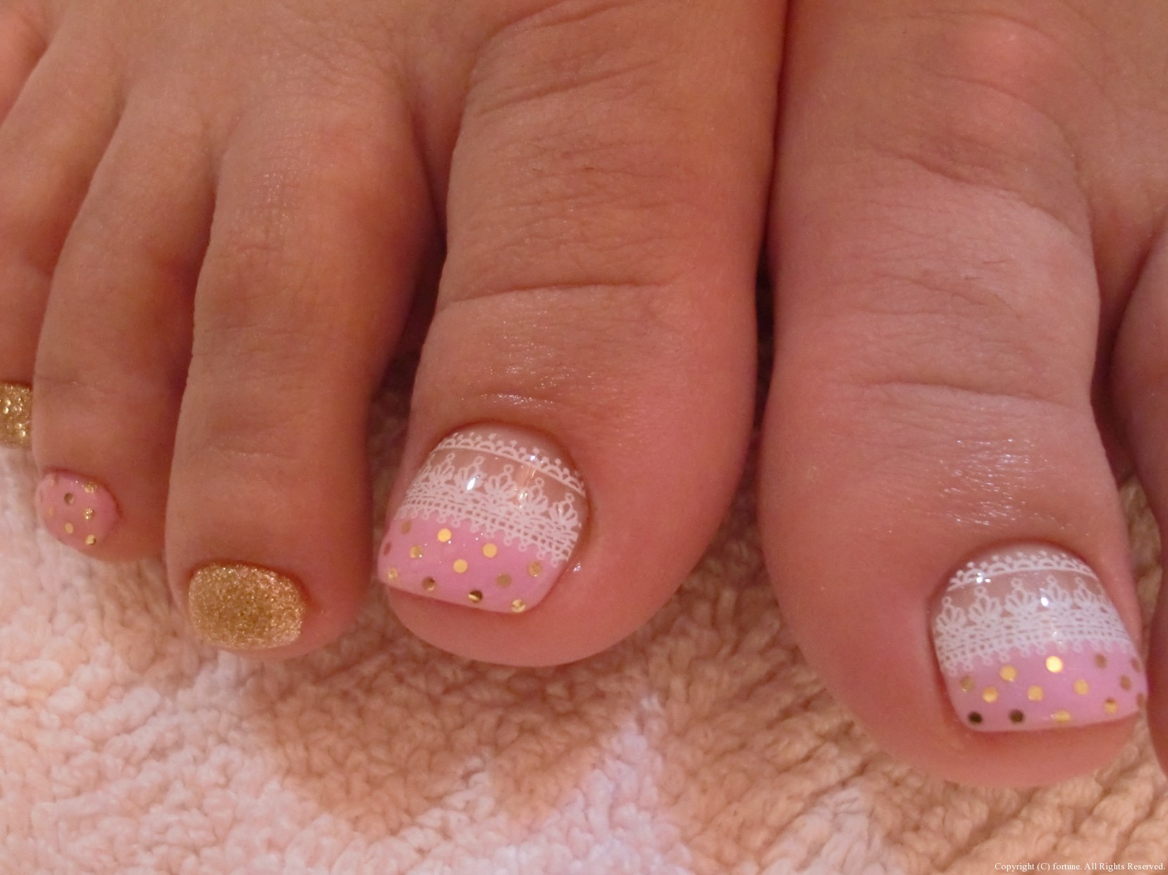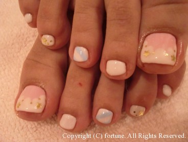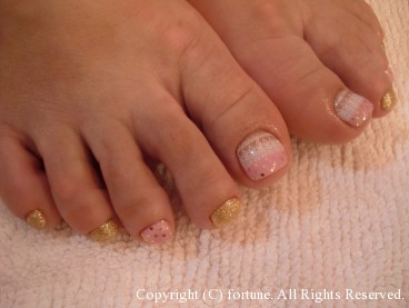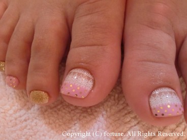 ハンドとフット シャンパンゴールドのラメグラデに、白の丸ホロでシンプルに可愛く♪ フットは新作。こちらもシャンパンゴールド。 ピンクにドットとレースでとっても可愛いです♪ 可愛いネイルで素敵な毎日を♡ NAOKO