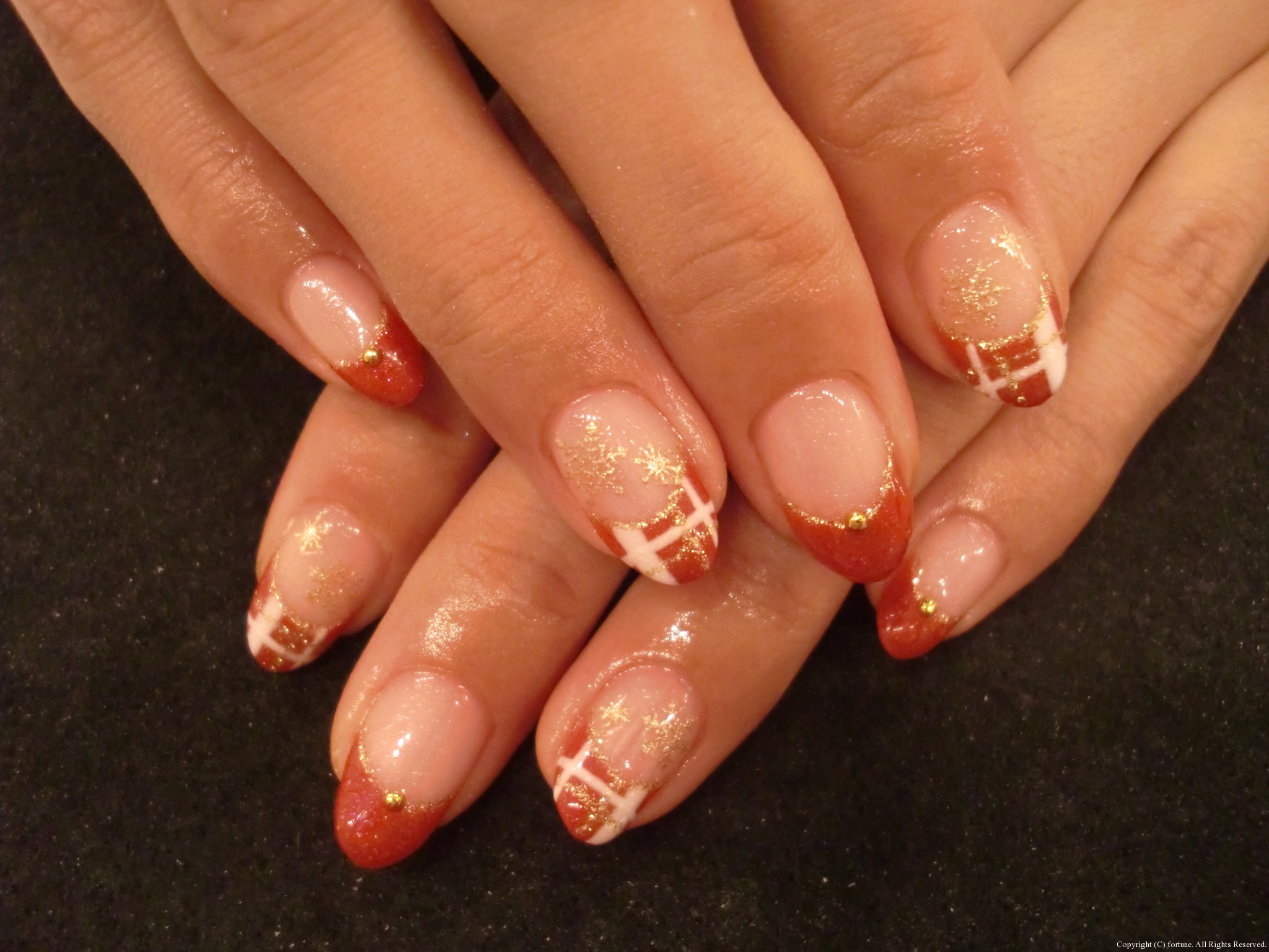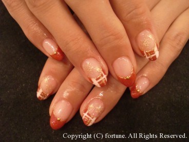 赤×白とゴールドラメのチェックにゴールドの雪をつけました★