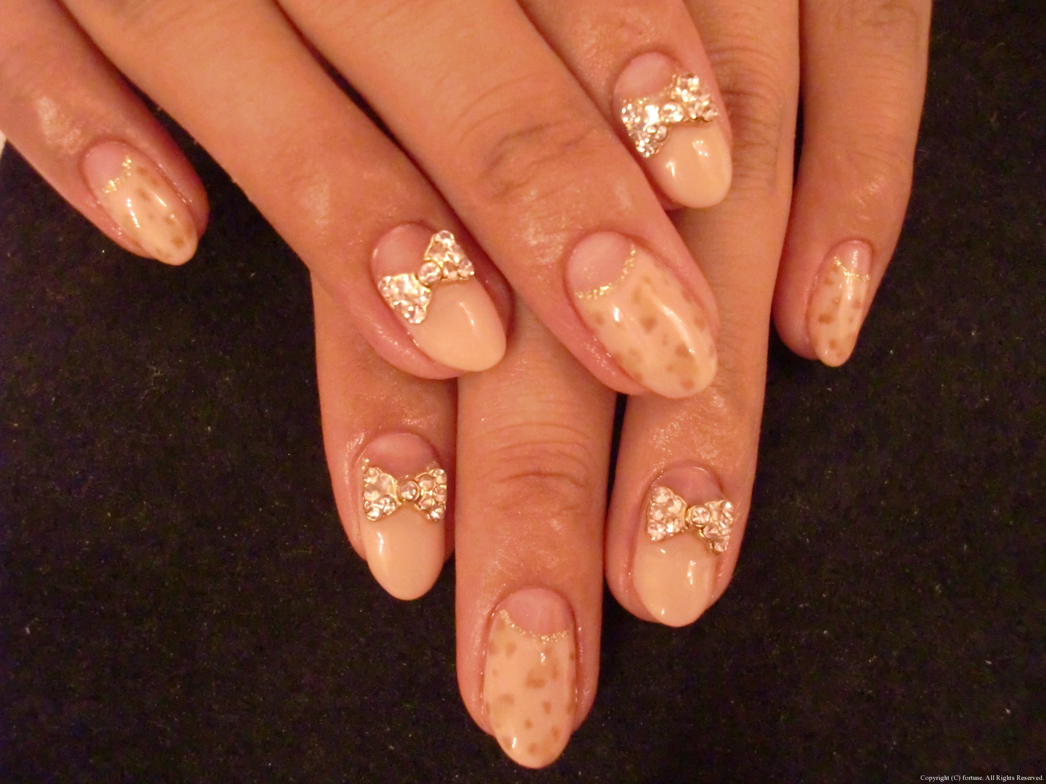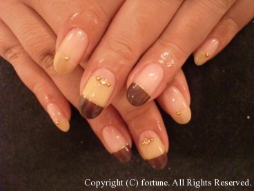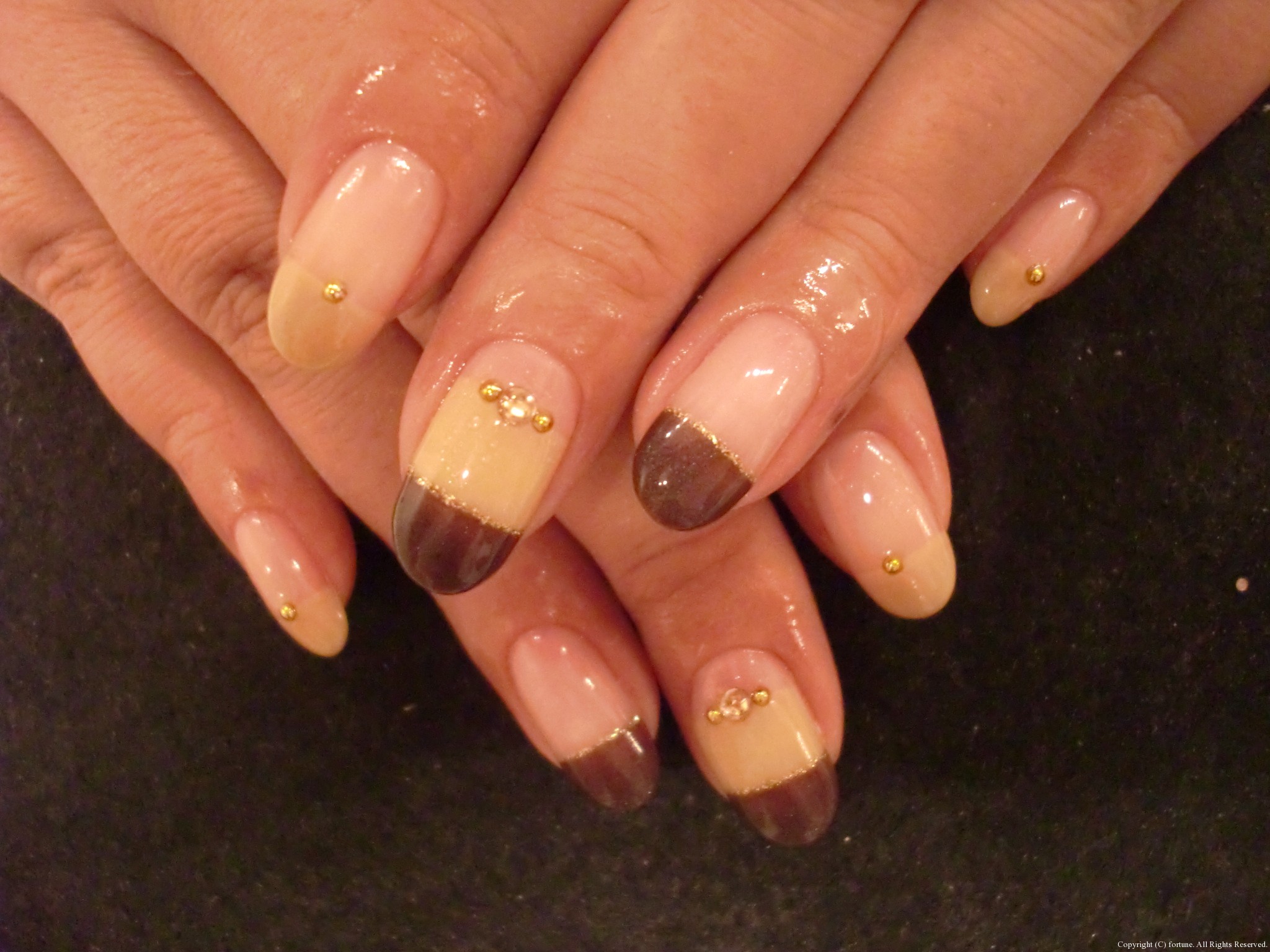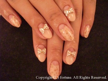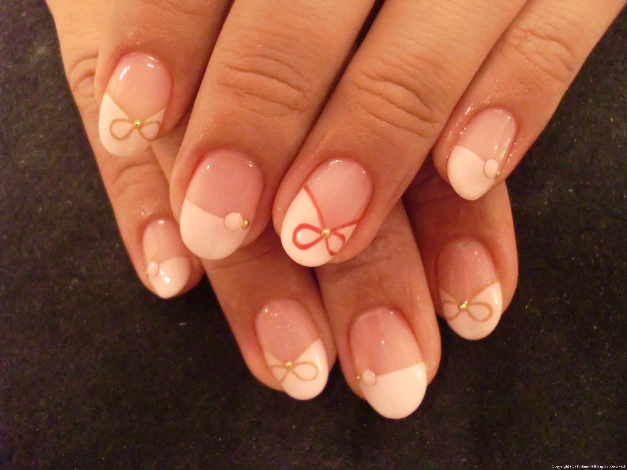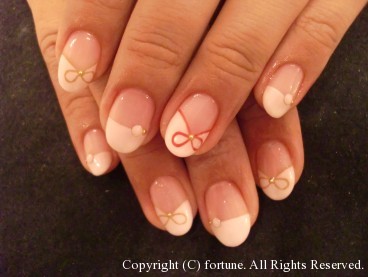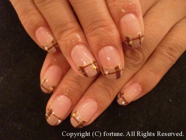 白のフレンチを、ブラウンのリボンデザインとパープルストーンで