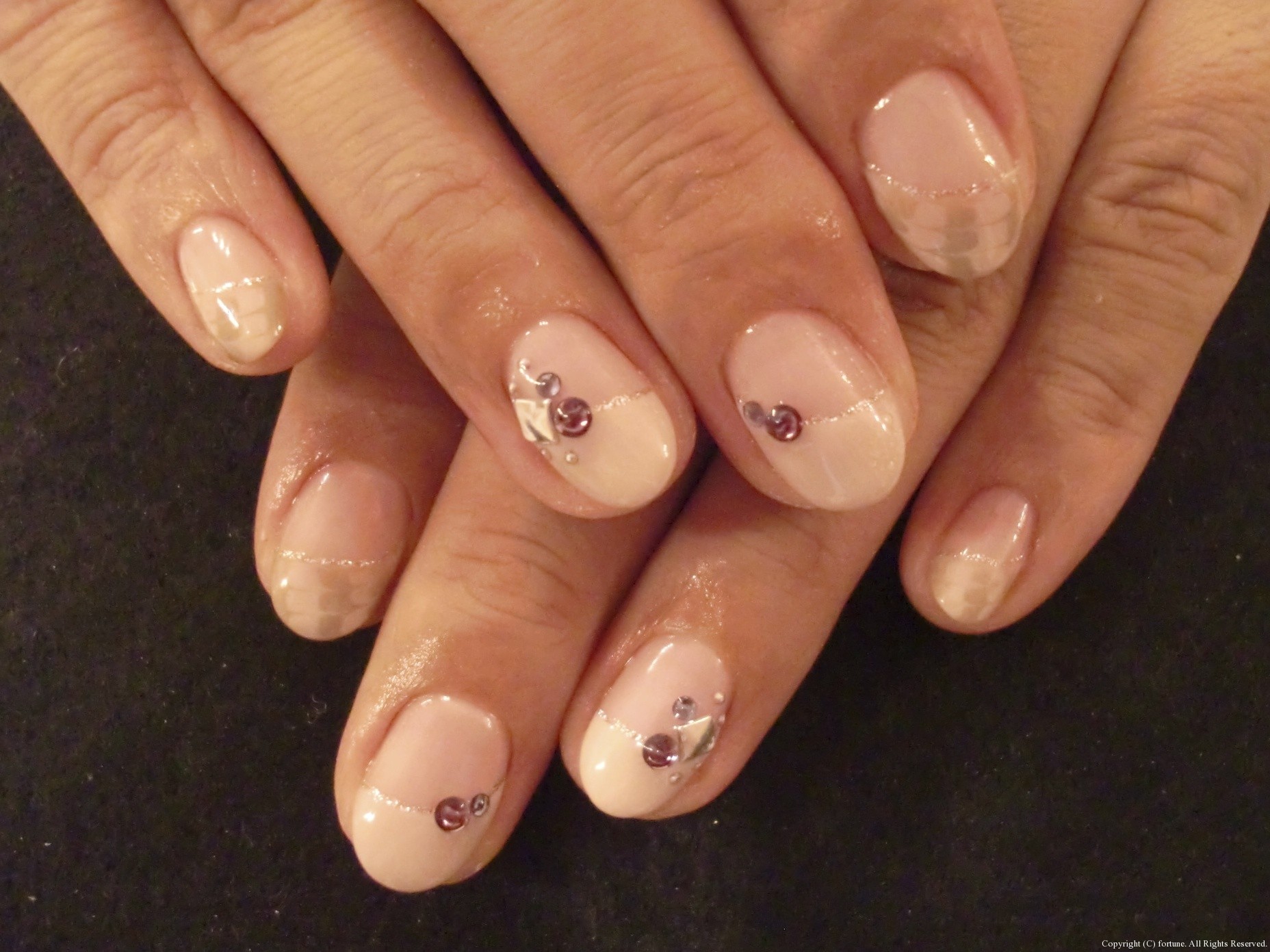 ピンクベージュにポイントで逆フレンチにストーンで華やかに♡