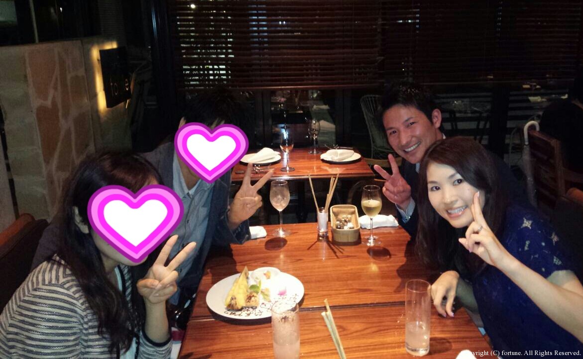 友人カップルと♪ 高校からの友人が婚約♡これはお祝いしなくては!!と、旦那様も一緒に 恵比寿のイタリアンで婚約お祝い♪ 相変わらず1杯で顔が真っ赤な旦那様!! お話に夢中でお料理の写真撮るのを忘れてしまいました。。。 大好きな友人なので、素敵な彼で一安心♡結婚式が楽しみです♪ では、お客様ネイルです☆ ホログラムのお花、人気です♪ 淡いイエロー×イエローのバイカラー☆ ベージュに濃いパープルが映えます♡ 色々なデザインをお楽しみ下さい♪ AIKO