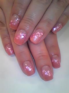 夜桜☆ 桜満開ですねー☆ 私は1週間ほど前に夜桜を見に行ってきました。 残念ながら2分咲きくらいでした。。。 でも雰囲気は楽しめたのでよかったです☆★ そんな桜にぴったりのネイルです! ななめフレンチの境目にラメを散らしてその上にホログラムをのせました♪ 春らしくてとってもかわいいですね!! ラメとホログラムの組み合わせはやはり素敵ですね☆ AYA