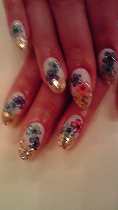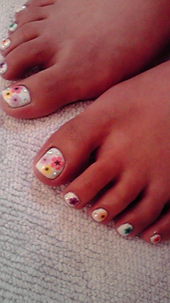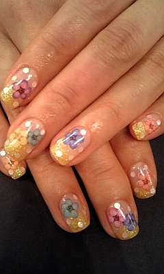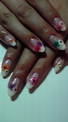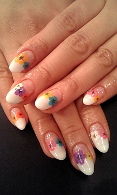 お花大人気☆ 春通り越して…夏みたいな気候の今日この頃です。 fortuneでは押花アートが大人気!! ホワイトベースでカラフルに押花アートをしました。ペディも お揃いにして、超〜キュートな足下♡サンダルも引立ちますね♪ ラメベースでホログラムと組み合わせても可愛いです☆ 押花アートはジェルで埋め込みだから引っかからないし、 取れないし、なのに存在感があってとっても可愛いですよ〜♡ ハンドでは目立って困る方もペディジェルで是非やって下さい☆ JUN