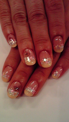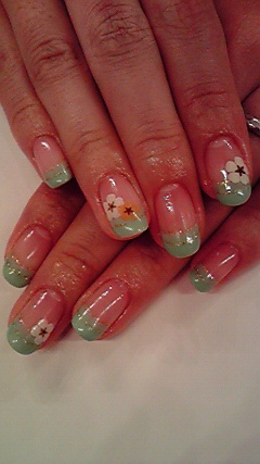 カラフル♪ もうすっかり春(日によっては初夏!!)ですね〜。 最近は明るい色のネイルをされる方が多いですよ☆ パステルグリーンのフレンチに、ラメラインを2段ひきました♪ ポイントで押し花をいれてレトロな雰囲気です♡ イエローのグラデーション、境にパステルカラー(多色)の ホログラムを♪春なので蝶もいれましたよ♡ AIKO