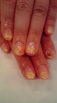 ラメラメちゃん♪ 最近はラメやホログラムなど、キラキラしたデザインがよくでています! こちらはイエローとオレンジの2色グラデーション★ ポイントでフルーツをのせました☆夏らしくてかわいいですね〜。 そうです!ファッション業界同様、ネイルも先取りが基本なのです♡ 今のうちから“夏ネイル”にしておくと、注目度UPですよ〜! AIKO ★☆★5月から毎月お得なメニューを1つだけサービス価格でご提供★☆★ 今月は★カルジェルフットケアラメ1色限定¥8400→¥7350★