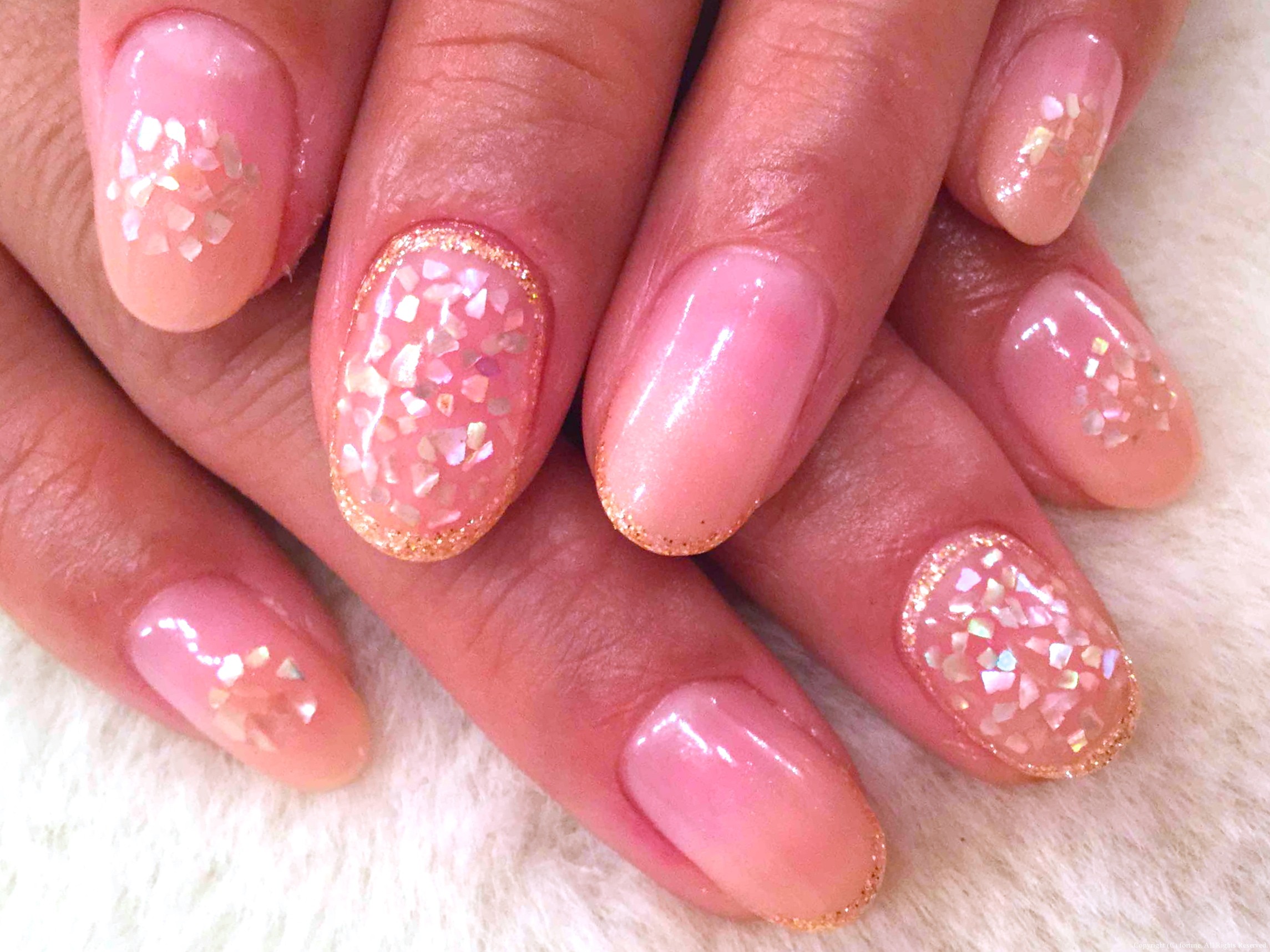 落ちついたベージュも、シェルをプラスするだけで、夏らしく華やかに♡