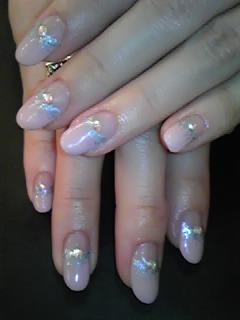 逆フレンチ☆ ピンクベージュの逆フレンチの境目に ブルーのラメを散らして1つずつストーンを置きました♡ ブルーが意外と(!?)ピンクととても合っていて 上品な感じに仕上がりました♪ 春物のお洋服にも合いそうですよね〜! AYA