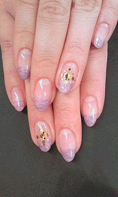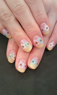 最近よく出るのは。 やはり押し花シールのアートが人気ですね。 このようにカラーグラデの境目にお花シールをのせるのが人気です。 こちらはパステルイエローのカラーグラデで。 とっても春っぽくってかわいいです♪ そしてそして。 こちらはエスニックな感じでしょうか♪ グラデーションマーブルを紫系で、ポイントのホログラムはゴールドで♪ ちなみに。 今年流行りのモロッコ系は。 オレンジとターコイズカラーを組み合わせると、それっぽくなるようです♪ 夏にむけて、試してみて下さい〜♪ NAOKO