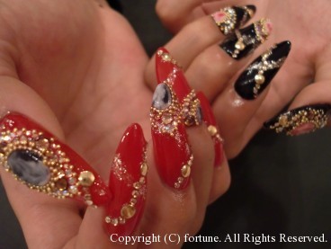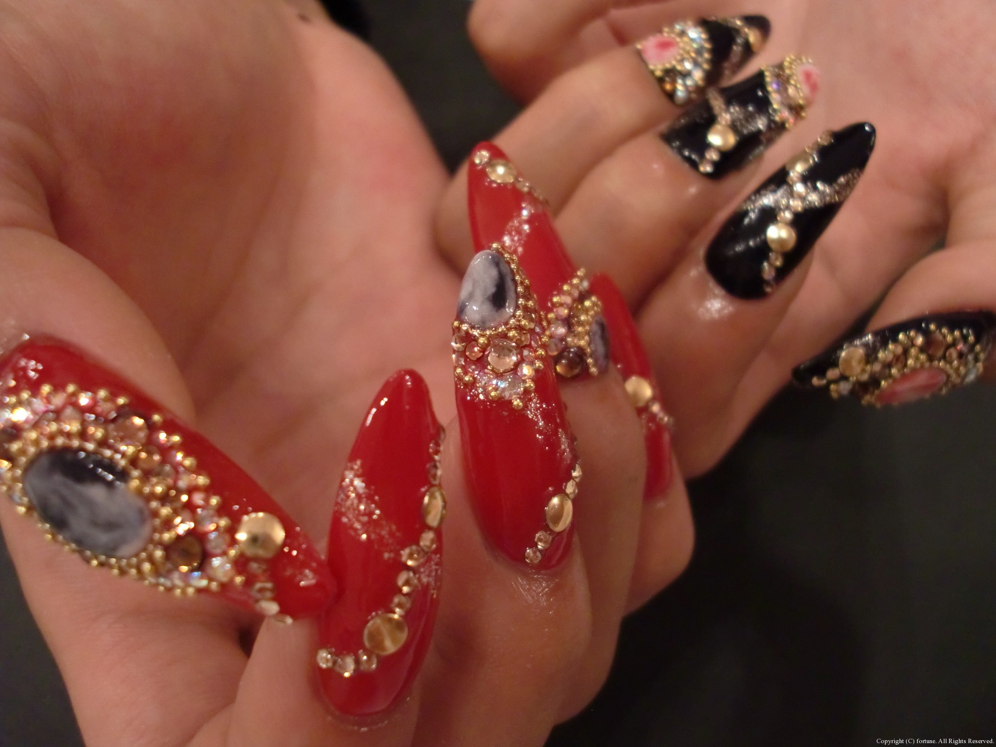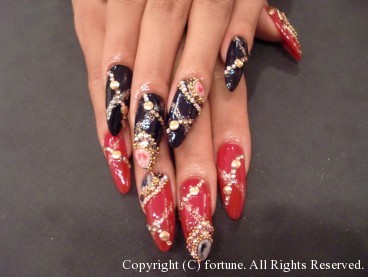 赤×黒ネイル☆ アクリルスカルプを長めにつけて、片手ずつ赤と黒に塗り分けました! 赤の上には白と黒・黒の上には白と赤を混ぜた、天然石風の3Dをつけて ストーンで囲いました♪♪回りにもストーンをたくさん☆ 遠目からでも目立つゴージャスアートです★ ジュエリーみたいで素敵でした♪ AIKO