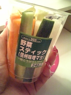 ハマりもの☆ もっぱらファミマ通いのわたくし… あるとついつい買ってしまう最近のハマりもの。 そう!野菜スティック!!味噌マヨ♪ 一時期この味噌マヨがバーニャカウダ??ニンニク味のに変わった 事があって!発狂しましたね…だって野菜スティックは味噌マヨで 食べるのが基本だと思ってるんでそんなん邪道ですよ。。。 でも、なんでセロリが入ってないの? …と、とっても残念に思う今日この頃です。 JUN
