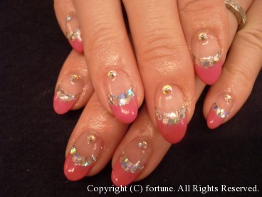 ピンクとラメホログラムのダブルフレンチ♡根元ストーンは10本に★