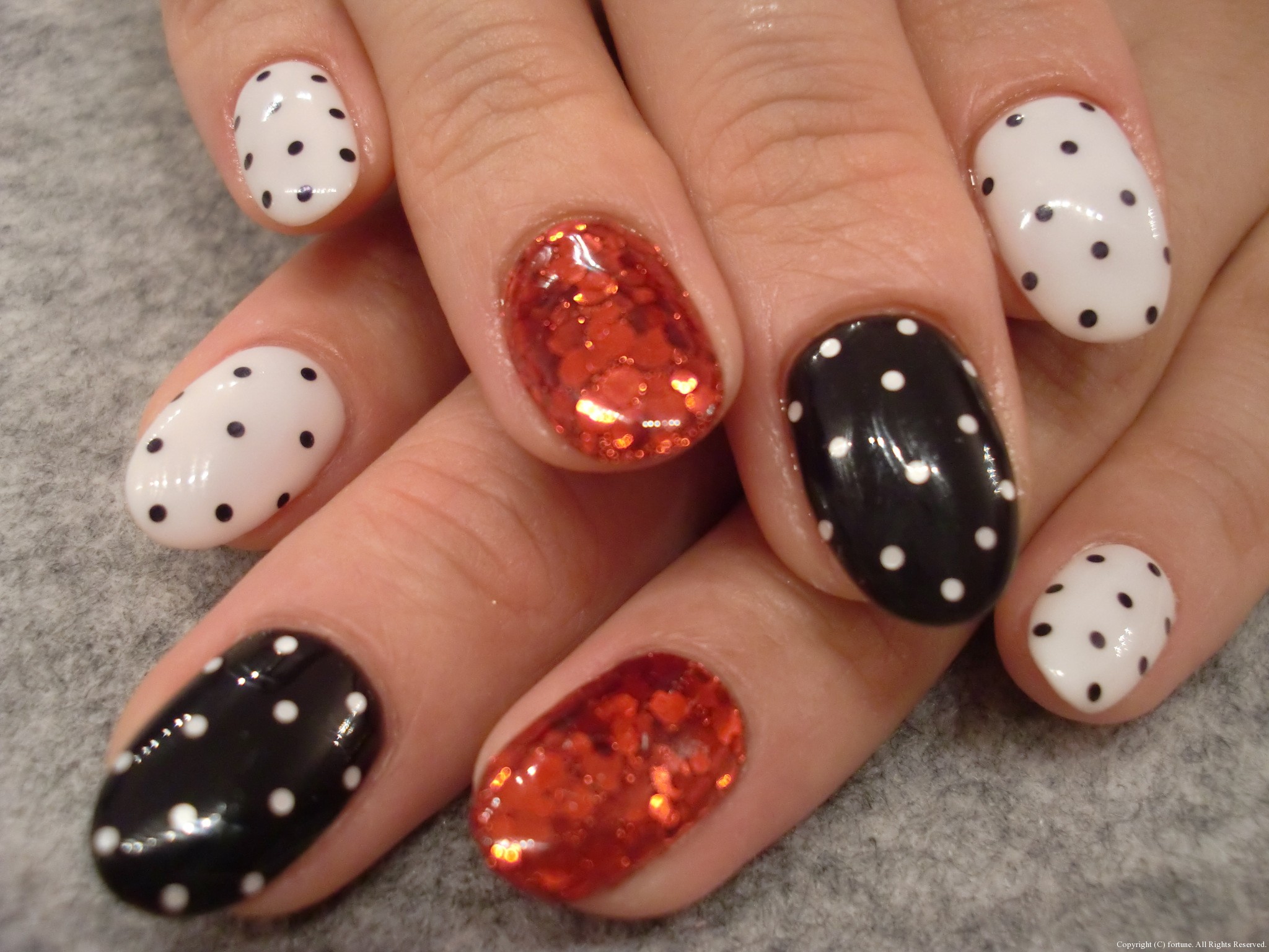 こちらはモノトーンドットにレッドホロでキュートに☆各指色違いや柄違いに