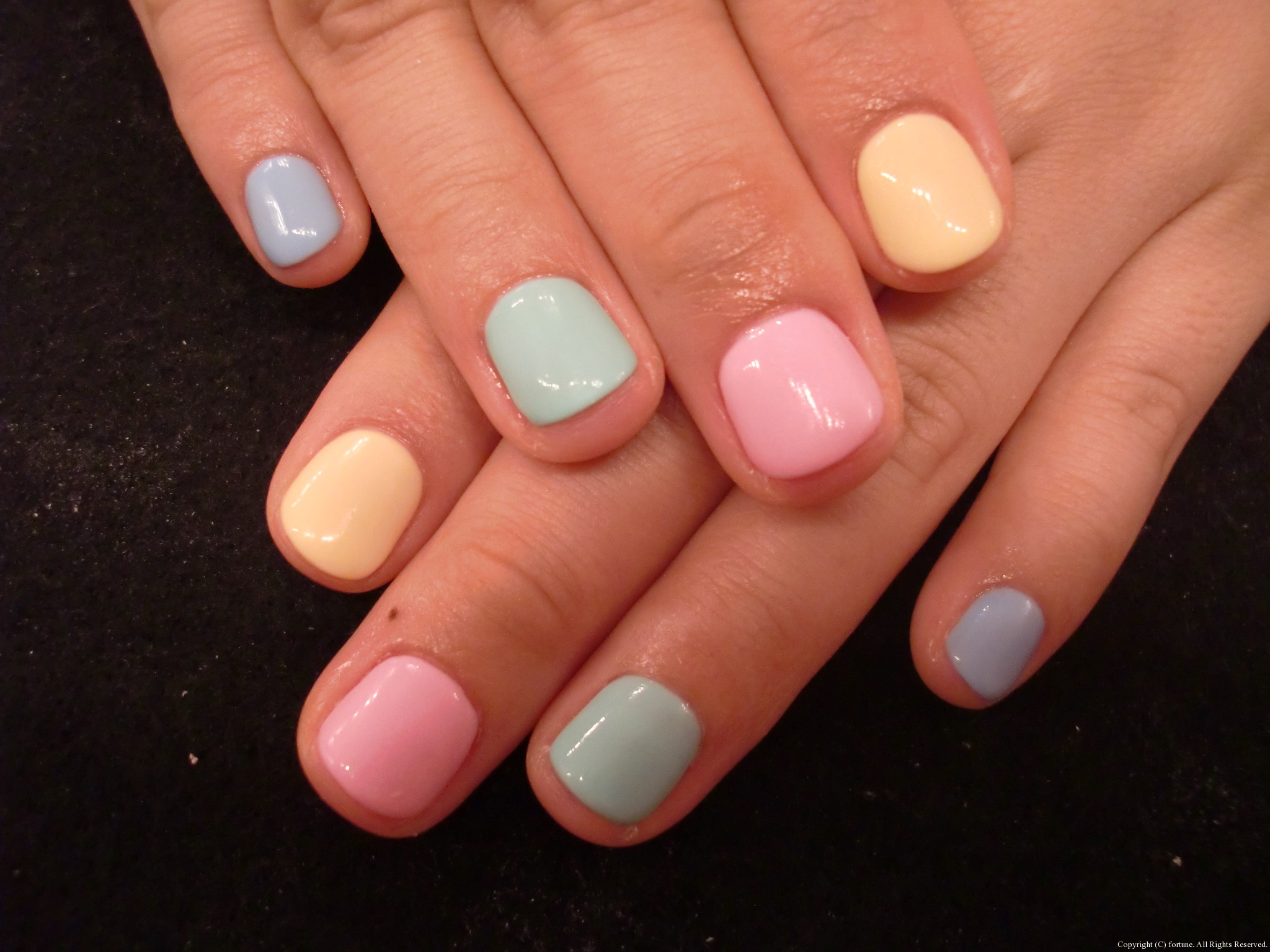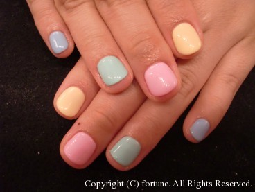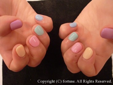 カラフル☆ 今日も暑いですね〜! 最高気温も高いみたいですね(><) 節電と言われていますが、無理をせず暑さ対策をしていきましょう! 5色のラメを使ったネイル☆ストーンをつけてキラキラに♪ パステル5色☆マカロンみたいで食べたくなっちゃいますね♪ みなさんもカラフルネイル挑戦してみて下さいねッ♪ AYA