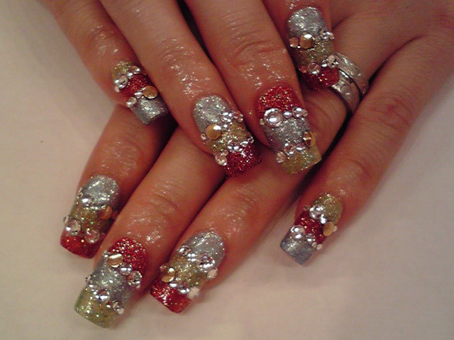 派手キラ☆ネイル スカルプ+アートです!3色のラメを塗り分けして、 境にストーンをたっぷりのせました★ お客様が「サンバ踊りたくなっちゃう(笑)」と おっしゃっていました♪そのくらいテンションが 上がるアートですね!! AIKO