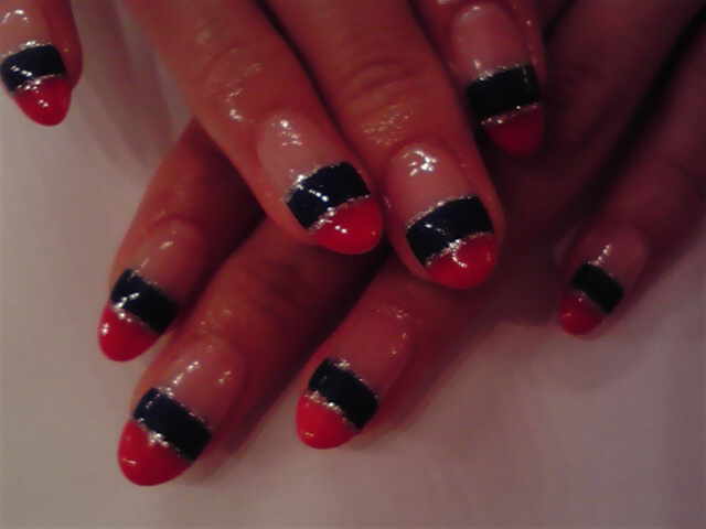 マリンちゃん☆ カルジェルで先端に2段のボーダーを作りました♪ 写真では黒と赤に見えますが…青と赤なんです!! シルバーラメのラインをひいて、かわいいマリンネイルです★ 写真が暗くていまいちかわいさが伝わらず…スミマセン!! AIKO