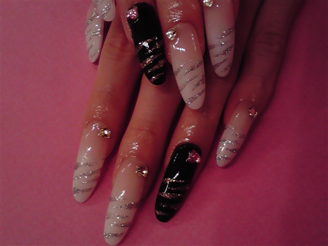 ラメゼブラ★ ロングスカルプにエアブラシのグラデーション、 シルバーラメでゼブラ柄を描きました!薬指だけポイントで 黒ベースにゴールドラメのゼブラです♪ 根元にストーンをキラリ☆ ゼブラでもハードになりすぎず、かわいかったです〜。 AIKO