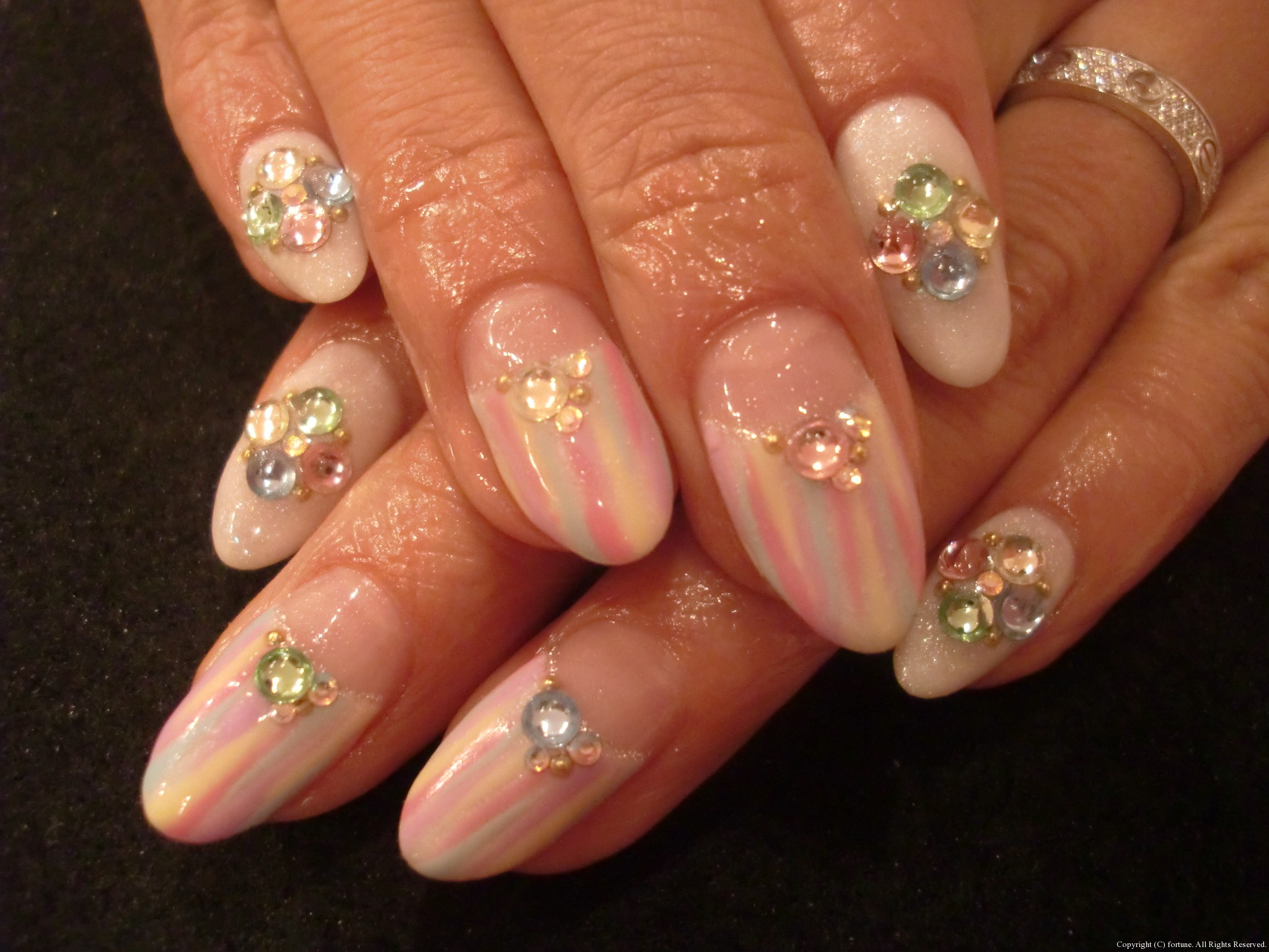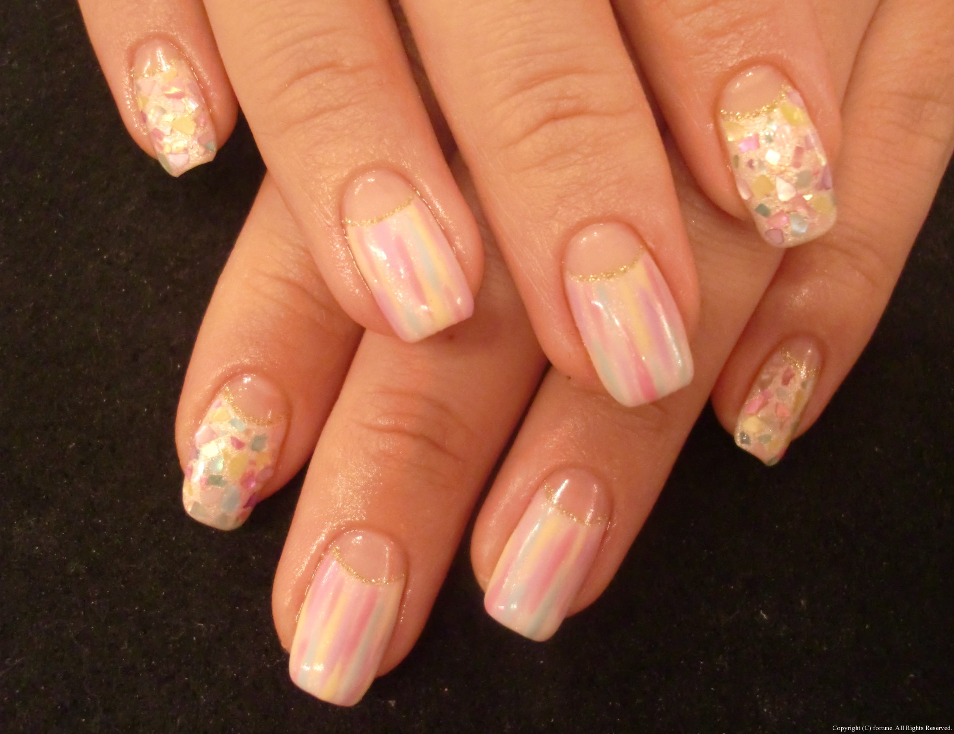 新作♪ 暖かくなり、華やかカラフルアートが人気です★ 逆フレンチに、ランダムなボーダーとシェル(貝)を組み合わせました♡ 逆フレンチとカラーの組み合わせにランダムなボーダーとストーンを♡ どちらも新作アートのアレンジバージョンです! 皆様も明るいカラーにチャレンジしてみて下さいね。 AIKO