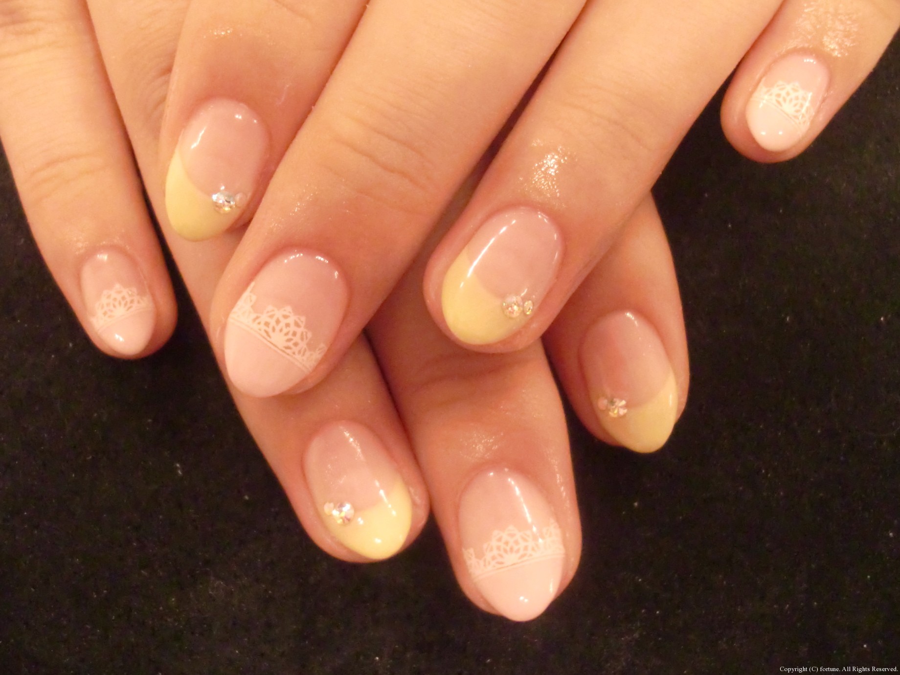 春フレンチ 春らしいカラーでプッチ柄風フレンチ♪ イエローとピンクのフレンチにレースとストーンで可愛く♡ 私はシンプル白フレンチにピンクのバラのシールでエレガントにしてみました♪ 春らしいフレンチネイル♥オススメです♡ NAOKO