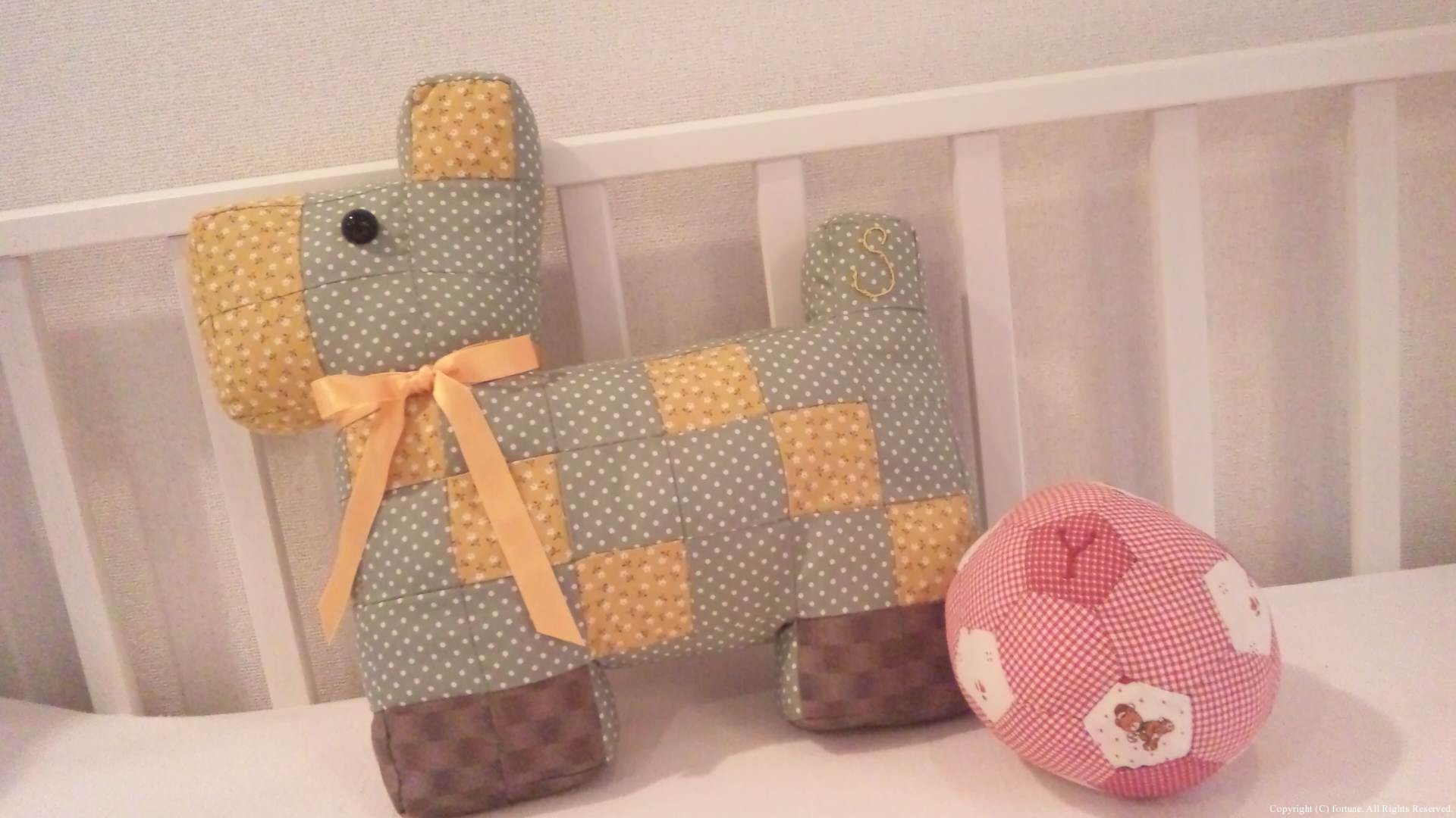 素敵なパッチワークのぬいぐるみを頂き、投げても、噛み付いても布製は安心です♡