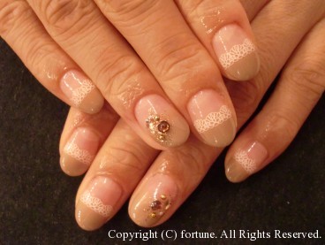 ジェルで長さ出し ご存知ない方がいらっしゃったので・・・カルジェルで、長さ出しできます! 自爪が短いから・・とジェルを諦めている方も、数本だけ折れて短くなったお爪も大丈夫ですよ♪ こちらは10本ジェルで長さ出しをして、シンプルフレンチ♡ 1本プラス¥735です♪ご予約の際に伝えて下さいね♡ レースとストーンで女の子らしく♪ ストライプフレンチも秋カラーで♪ みなさん秋ネイルを満喫しましょう♪ NAOKO