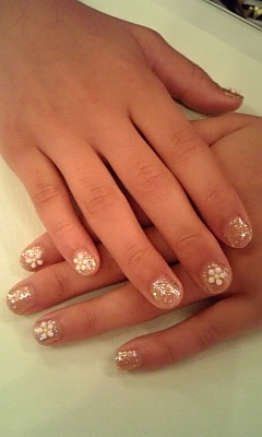 Kid’sネイル♪ 今日も親子で御来店★10才の女の子です!! ちょっと大人っぽく、ゴールドラメにしました。 でも、白いお花で かわいさも忘れず・・ね☆ 親子でおしゃれを楽しめるなんて、本当に素敵!! 私もいつか娘と・・って子供はいませんが。。。結婚もしていませんが・・。 それよりなにより・・(笑) AIKO