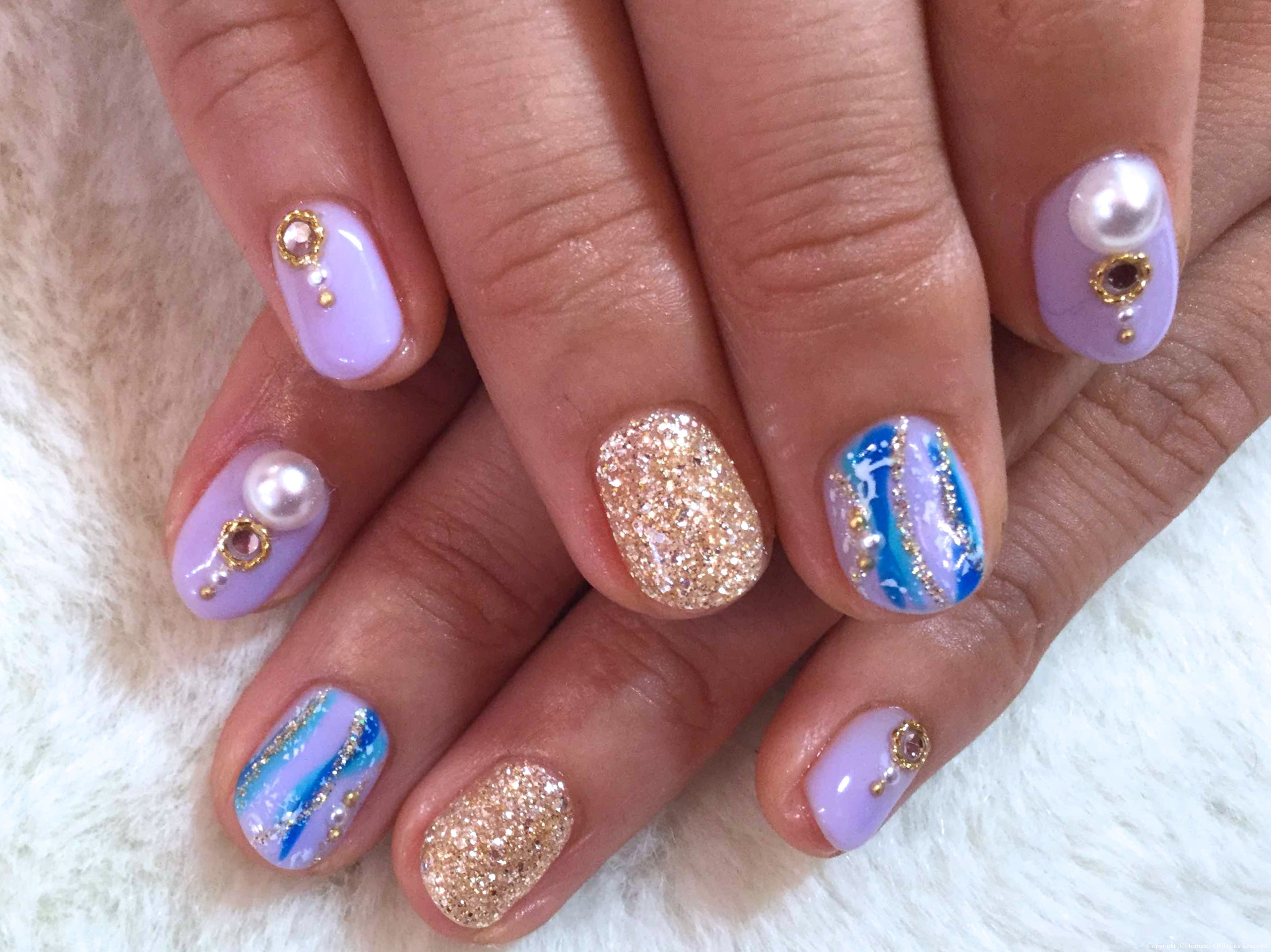 ラメ入りベージュのグラデーションに、シェルとホログラムがさりげなくキラキラ☆